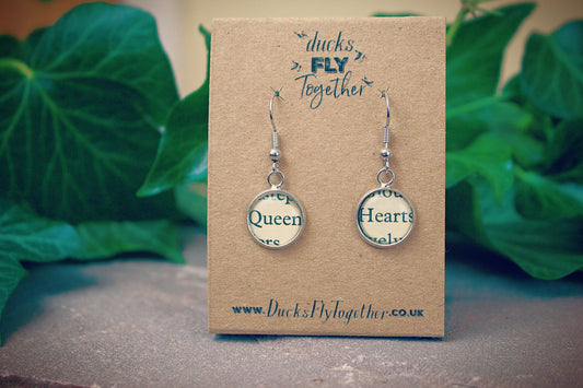 Alice in Wonderland Earrings. Vintage children's story. Recycled book pages. Queen of Hearts. Mad Hatter. White Rabbit. Cheshire Cat. Retro